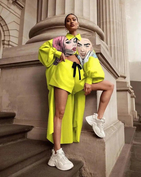 - Detalhes adicionais: Design gráfico frontal, bainha dividida que se estende em uma silhueta alta-baixa