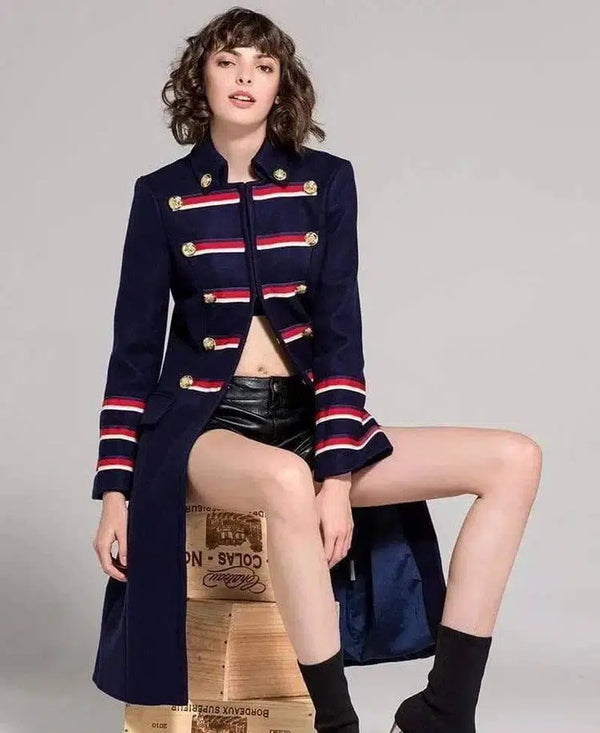 Vintage Fashion Striped Metal Button Blue Punk/Military Long
