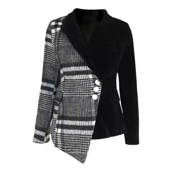 - Detalhes do design: Xadrez contrastante e painéis sólidos, trespassado com botões decorativos