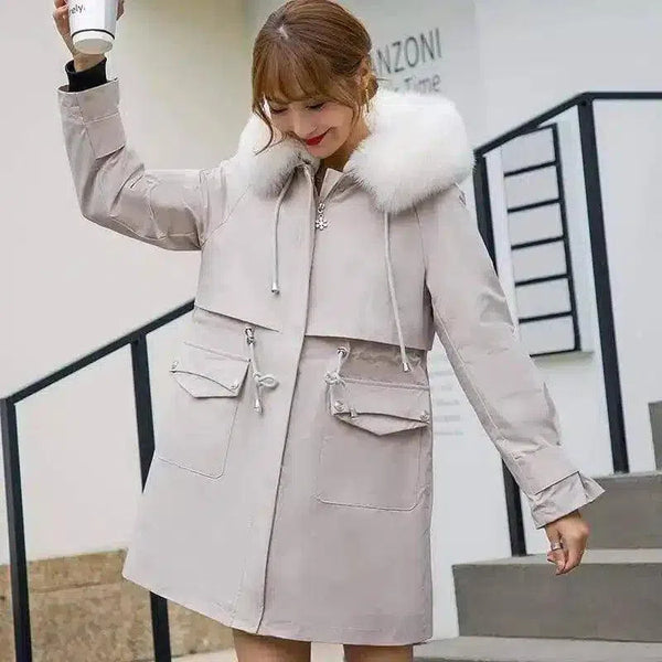 Casaco de inverno feminino com gola de pele falsa e bolsos