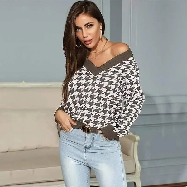 Manga comprida feminina com gola em V e jacquard Houndstooth