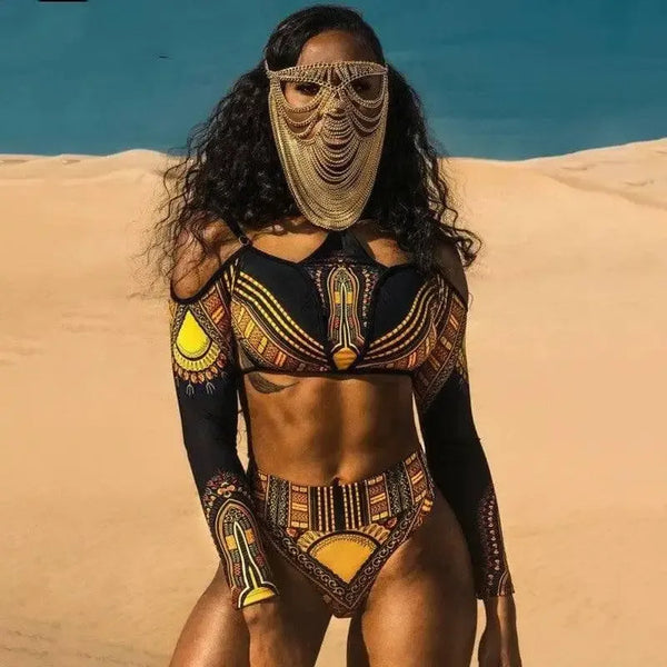 Biquíni feminino de cintura alta com estampa de manga longa e duas peças