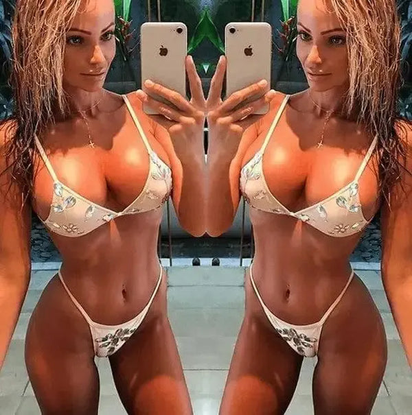 - Design: Conjunto de biquíni elegante e glamouroso adornado com detalhes luxuosos de diamantes e brilhantes.
