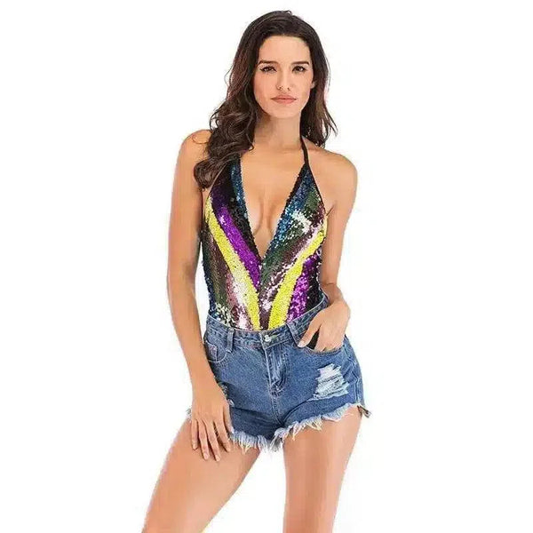 Bodysuit com lantejoulas e shorts jeans rasgados