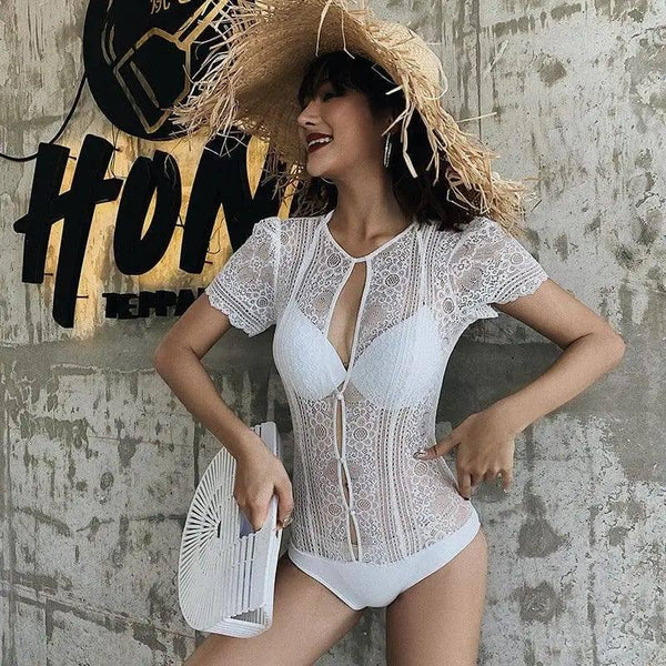 - Estilo: maiô elegante de uma peça com detalhes de recorte em renda