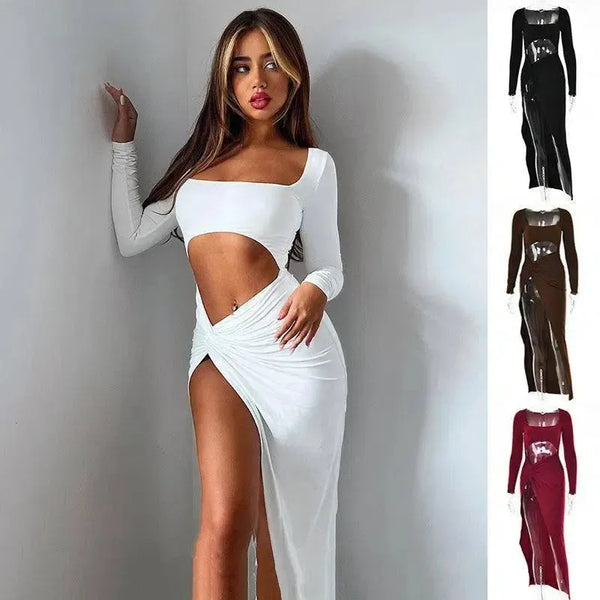 Roupas femininas Vestido de manga comprida Fashion Hollow U-neck Split Dress Party Wedding