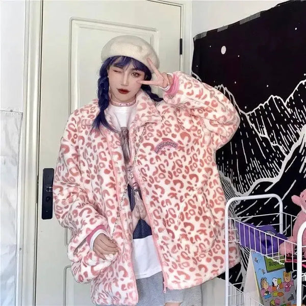 Versão coreana do casaco de inverno acolchoado e solto de lã de carneiro rosa