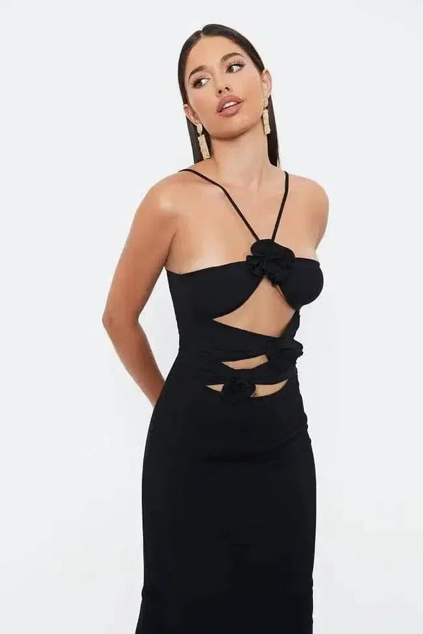 Flower Hollow Slim -fitting Neck Mid -length Suspender Dress