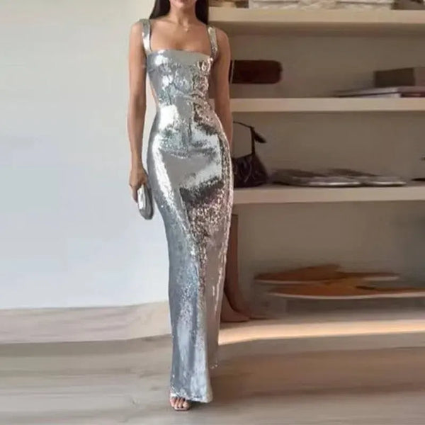 Lantejoulas Gola quadrada Vestido sem costas Vestido Saia