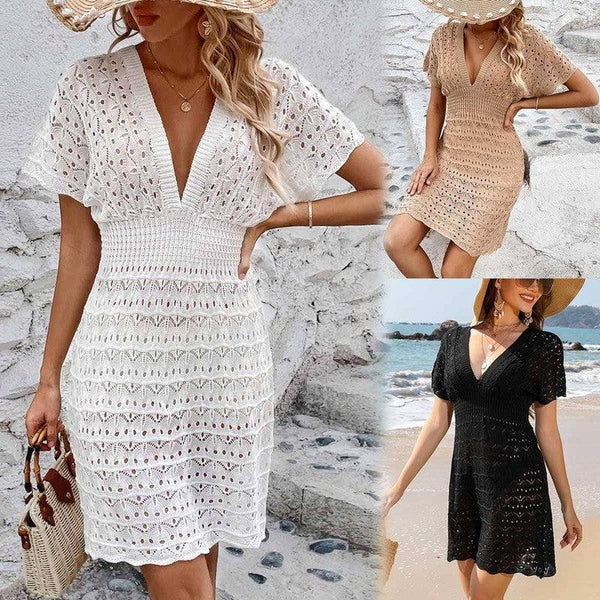 Vestido de praia com decote em V profundo e padrão ondulado, vazado