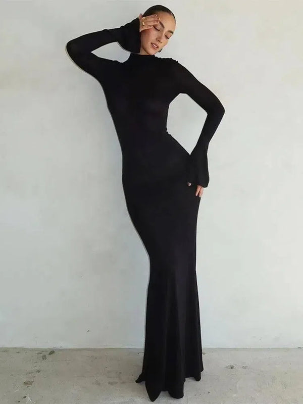 Vestido maxi sólido sem costas – roupa de noite com manga trompete