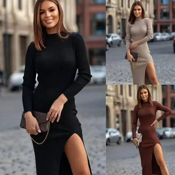 Vestidos de outono e inverno com gola redonda e cores sólidas e finas